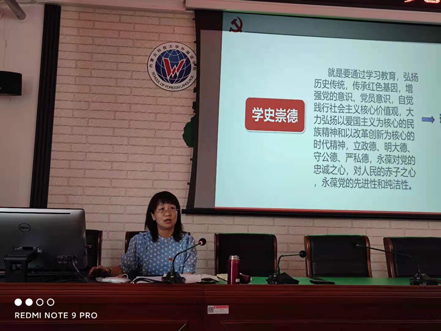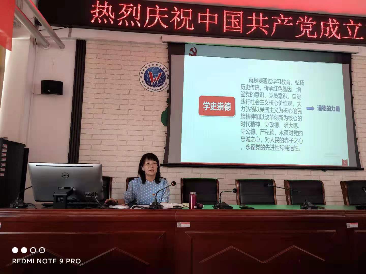 6月30日下午,外国语公司党总支书记张利敏讲授了题为《学习习近平论中国共产党历史 深入推进党史学习教育》的专题党课。张利敏以《论中国共产党历史》这本党史学习教育指定读物为依托,主要讲述了三方面的内容:学习习近平论中国共产党历史;认真研读党史基本著作,理解习近平论中国共产党历史;深入推进党史学习教育,揭秘中国共产党为什么“能”。