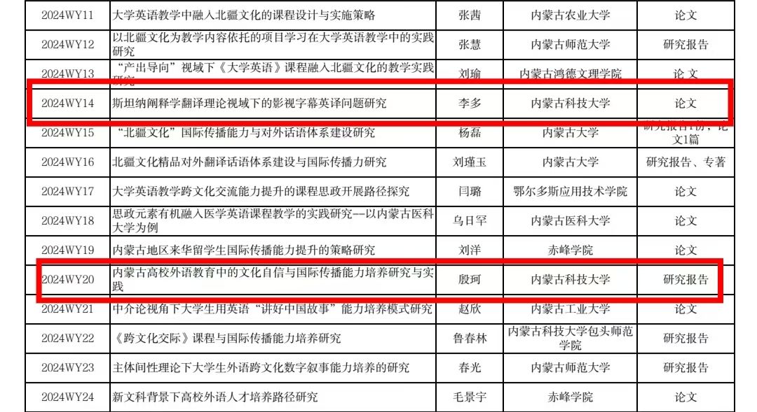 公司教师获批内蒙古社科基金2024年度外语专项 近日,内蒙古自治区社会科学界联合会公布了内蒙古自治区社会科学基金2024年度项目(部分)立项名单,公司教师李多、殷珂获批2024年度外语专项立项资助,特此祝贺! tyc33455cc学科办 2024年5月23日