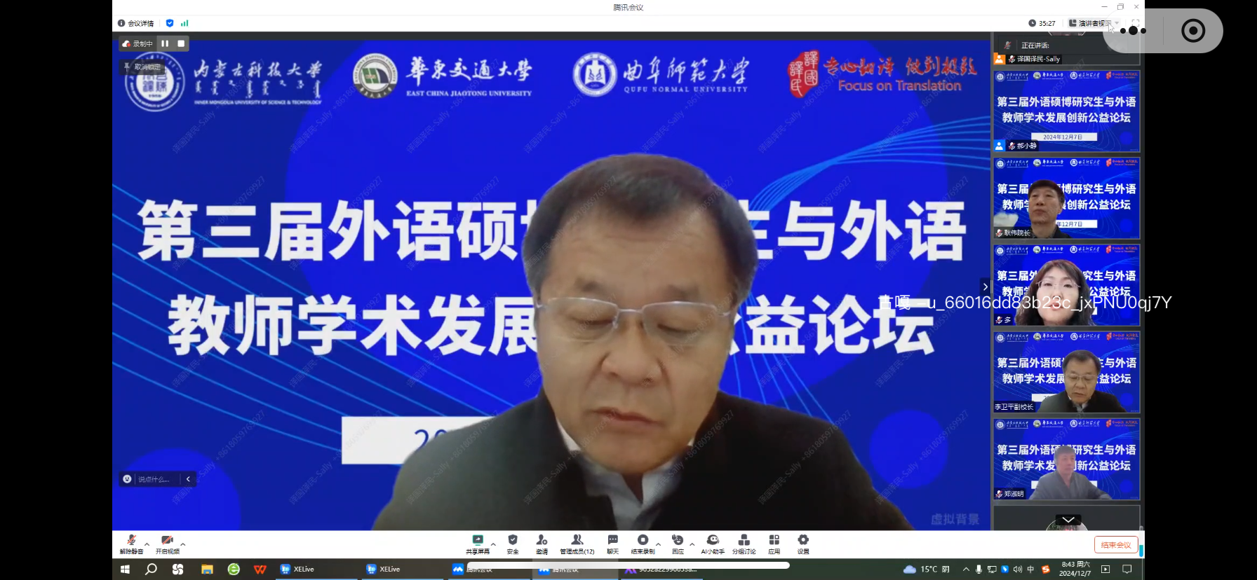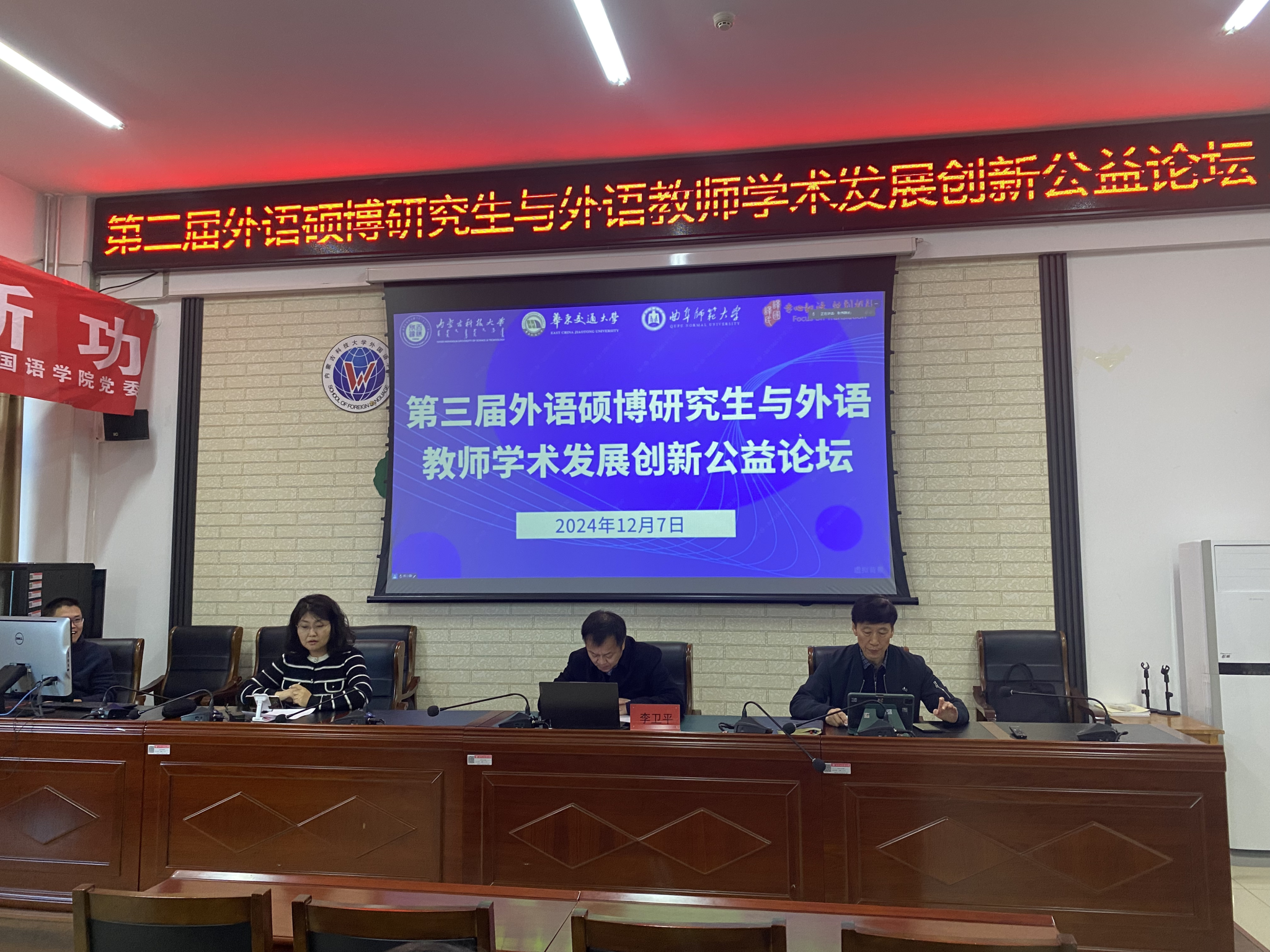 12月7日,“第三届外语硕博士研究生与外语教师学术发展创新公益论坛”成功举办,副董事长李卫平出席tyc33455cc线下会场并致开幕辞。此次论坛由tyc33455cc主办,译国译民集团承办,华东交通大学、曲阜师范大学合办。来自广东外语外贸大学、华中科技大学、哈尔滨工业大学、东北师范大学、tyc33455cc等全国各大高校的专家学者、师生代表线上线下参加了论坛。