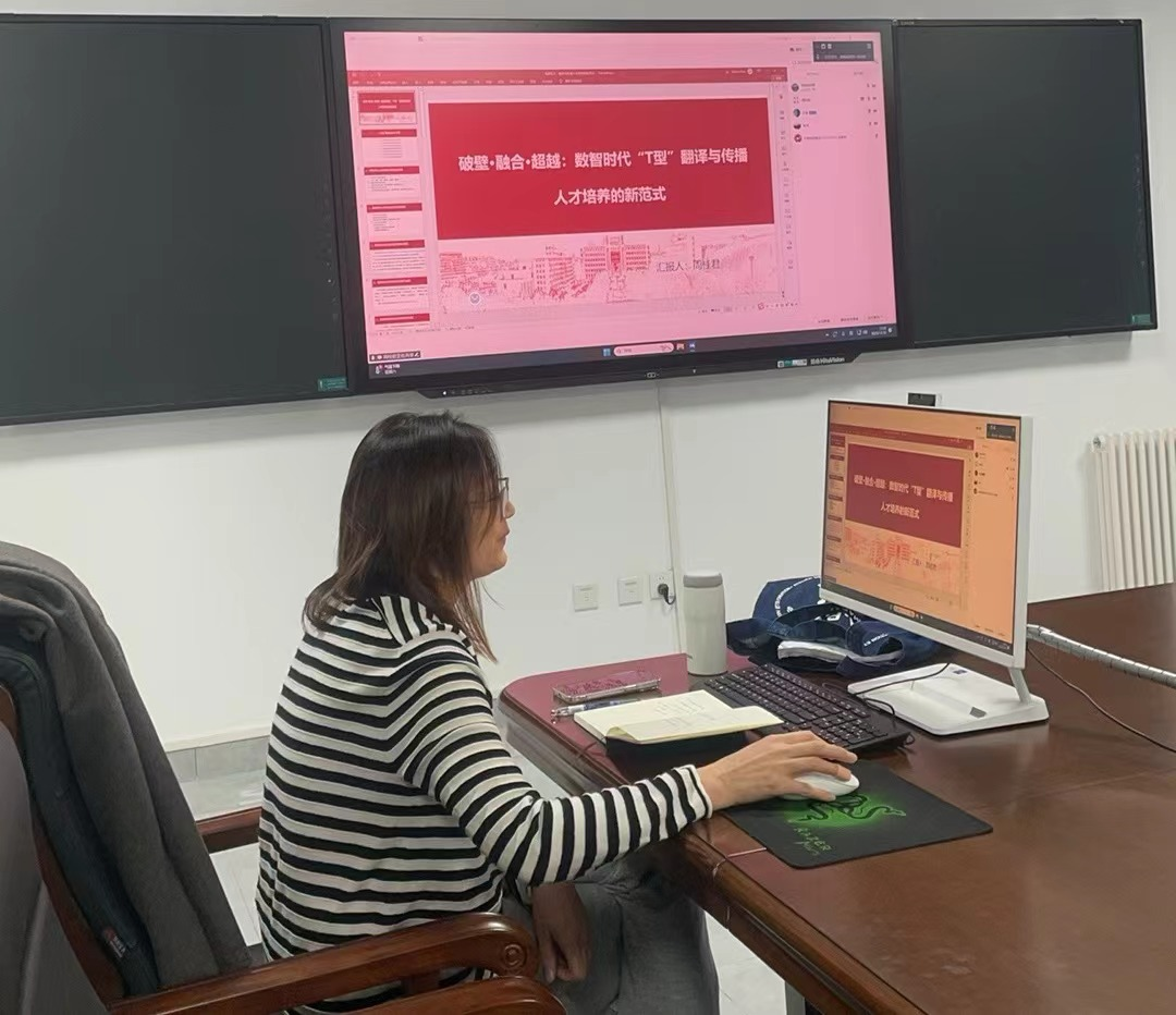 在讲座中,穆雷教授深以“翻译专业教育发展中的问题与探索”为题,结合国内外翻译教育的发展历程与现实案例,系统剖析了当下翻译专业在课程体系适配性、团队队伍专业化、理论与实践融合度、人才培养与市场需求对接等方面存在的突出问题,并从学科定位优化、课程模块创新、实践平台搭建、评价体系完善等多个维度,提出了一系列兼具可行性与前瞻性的探索路径。随后,周桂君教授以“破壁融合超越:数智时代,‘T型’翻译与传播人才培养的新范式”为主题,点明了高端译传人才培养的必要性,指出当前学位点需在扩大规模后转向质量升级,回应了穆雷教授提出的学科布局与资源配置问题。
